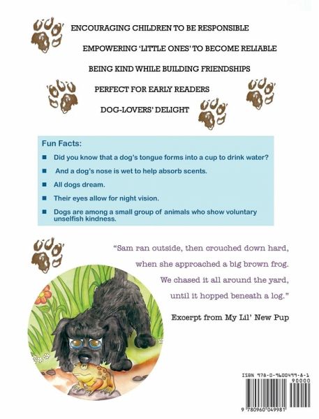 Forever Home Please! Perfect for Early Readers, this story encourages children to be Responsible and Reliable while building new friendships. When a lovable, floppy-eared puppy finds her way to Brooke Lynn's front porch, it sparks a new adventure for one sweet girl. Did this canine cutie get lost or was she abandoned and left to stray? With her Mom's help, they enthusiastically attempt to solve the mystery of this little shaggy pup and hope their home will become this new furry friend's forever home. This exuberant and colorfully illustrated tale is sure to win a few hearts -- including yours! "Sam ran outside, then crouched down hard, when she approached a big brown frog. We chased it all around the yard until it hopped beneath a log." Excerpt from My Lil' New Pup Bonus review questions are included at the "tail" end.