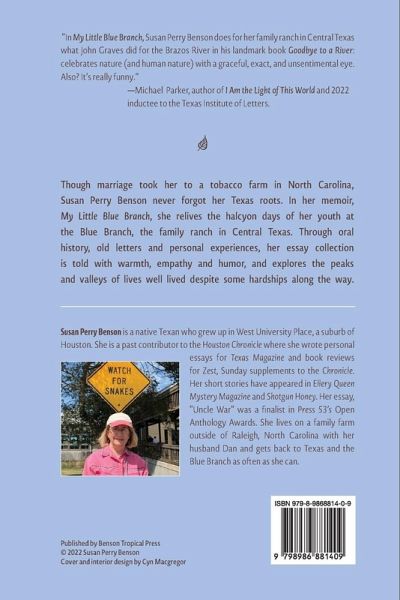 In her memoir, My Little Blue Branch, Susan Perry Benson describes the pleasures, perils, and pitfalls of owning a small ranch in the Texas Hill Country. Written over a twenty-year period, her essay collection unfolds with the idyllic childhood weekends at the Blue Branch along with bonds sometimes stretched thin. Her narrative also touches on the lives of her grandparents who settled there in the early 1930's, her mother's struggle with clinical depression and sudden death at the ranch to her father's declining health and managing elder care from a thousand miles away. While it's a sober look at death and aging, the narrative is laced with humor throughout. Though marriage took her to a tobacco farm in North Carolina, Susan Perry Benson never forgot her Texas roots. In her memoir, My Little Blue Branch, she relives the halcyon days of her youth at the Blue Branch, the family ranch in central Texas. Through oral history, old letters and personal experiences, her essay collection is told with warmth, empathy and humor, and explores the peaks and valleys of lives well lived despite some hardships along the way.