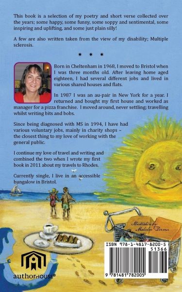 A selection of my poetry and short verse collected over the years; some happy, some funny, some soppy and sentimental, some inspiring and uplifting, and some just plain silly! A few are also written taken from the view of my disability; Multiple sclerosis. Born in Cheltenham in 1968, I moved to Bristol when I was three months old. After leaving home aged eighteen, I had several different jobs and lived in various shared houses and flats. In 1987 I was an au-pair in New York for a year. I returned and bought my first house and worked as manager for a pizza franchise. I moved around, never settling; travelling whilst writing bits and bobs. Since being diagnosed with MS in 1994, I have had various voluntary jobs, mainly in charity shops - the closest thing to my love of working with the general public. I continue my love of travel and writing and combined the two when I wrote my first book in 2011 about my travels to Rhodes. Currently single, I live in an accessible bungalow in Bristol.