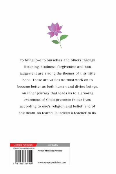 To bring love to ourselves and others through listening, kindness, forgiveness and non judgement are among the themes of this little book. These are values we must work on to become better as both human and divine beings. An inner journey that leads us to a growing awareness of God's presence in our lives, according to one's religion and belief, and of how death, so feared, is indeed a teacher to us.