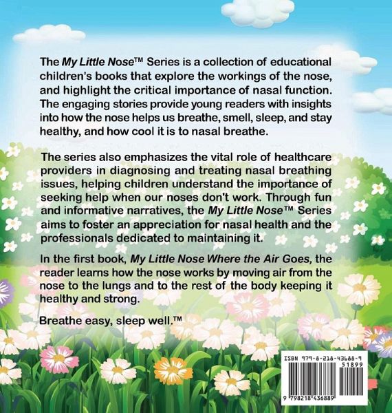 "My Little Nose: Where the Air Goes" is a delightful children's book that takes young readers on a whimsical journey through the nasal passages. The story follows a curious child who learns about the important role their nose plays in breathing, filtering air, sleep and keeping their body healthy. With engaging illustrations and simple, easy-to-understand language, the book explains how air travels through the nose, gets cleaned by tiny hairs and mucus, and then moves into the lungs. Along the way, children are introduced to the concepts of nasal hygiene and the importance of keeping their…mehr