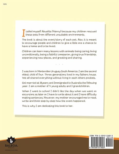 I called myself Abuelita (Nanny) because my children rescued these pets from different unsuitable environments. The book is about the event/story of each pet. Also, it is meant to encourage people and children to give a little one a chance to have a home and to be loved. Children can learn many lessons with animals: being caring, loving unconditionally, being a faithful companion, giving true friendship, experiencing new places, and greeting and sharing.