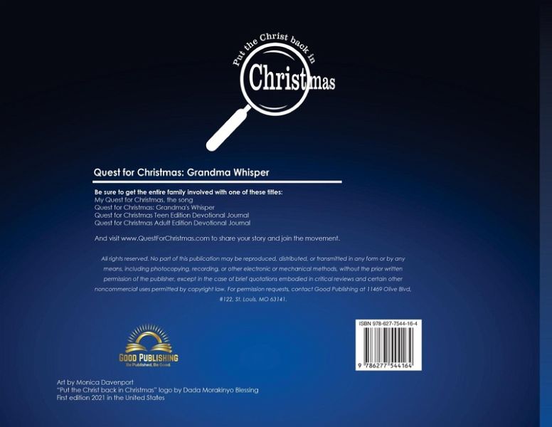 Twenty five days of devotion and activity to help you put the Christ back in Christmas for your child(ren). As an accompaniment to Quest for Christmas: Grandma's Whisper, this devotional will engage your child(ren) in reconstructing the events surrounding the birth of Christ through meaningful playtime, coloring, crafts, and much more!