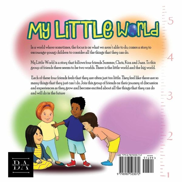 2023 Purple Dragonfly Book Award Winner In a world where sometimes, the focus is on what we aren't able to do, comes a story to encourage young children to consider all the things that they can do. My Little World is a story that follows four friends Summer, Chris, Kira and Juan. To this group of friends there seems to be two worlds. There is the little world and the big world. Each of these four friends feels that they are often just too little. They feel like there are so many things that they just can't do. Join this group of friends on their journey of discussion and experiences as they grow and become excited about all the things that they can do and will do in the future.