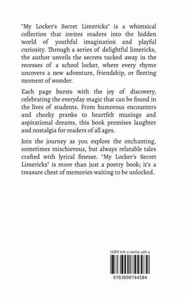 "My Locker's Secret Limericks" is a whimsical collection that invites readers into the hidden world of youthful imagination and playful curiosity. Through a series of delightful limericks, the author unveils the secrets tucked away in the recesses of a school locker, where every rhyme uncovers a new adventure, friendship, or fleeting moment of wonder. Each page bursts with the joy of discovery, celebrating the everyday magic that can be found in the lives of students. From humorous encounters and cheeky pranks to heartfelt musings and aspirational dreams, this book promises laughter and nostalgia for readers of all ages. Join the journey as you explore the enchanting, sometimes mischievous, but always relatable tales crafted with lyrical finesse. "My Locker's Secret Limericks" is more than just a poetry book; it's a treasure chest of memories waiting to be unlocked.