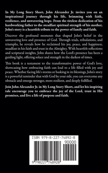 In My Long Story Short, John Alexander Jr. invites you on an inspirational journey through his life, brimming with faith, resilience, and unwavering hope. From the tireless dedication of his hardworking father to the steadfast spiritual strength of his mother, John's story is a heartfelt tribute to the power of family and faith. Discover the profound moments that shaped John's belief in the unwavering love and presence of God. Through trials, tribulations, and triumphs, he reveals how he reclaimed his joy, peace, and happiness, steadfast in his faith and trust in the Almighty. With heartfelt reflections and scriptural insights, John shares how the Lord's presence has been a guiding light, offering solace and strength in the darkest of times. This book is a testament to the transformative power of God's love, showcasing how embracing faith can lead to a life filled with joy and peace. Whether facing life's storms or basking in its blessings, John's story is a powerful reminder that with God by your side, you can overcome any obstacle and emerge stronger, more resilient, and deeply fulfilled. Join John Alexander Jr. in My Long Story Short, and let his inspiring tale encourage you to embrace the joy of the Lord, trust in His promises, and live a life of purpose and faith.