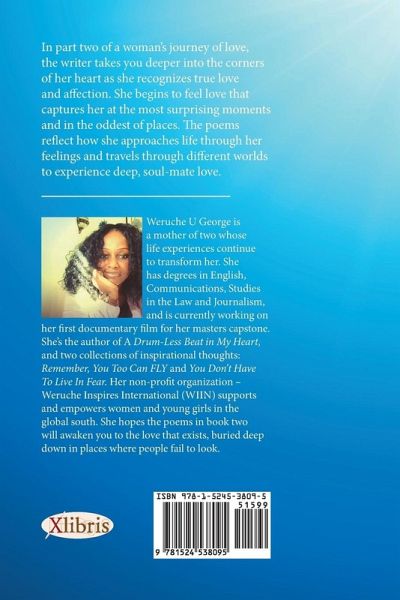 In part two of a woman's journey of love, the writer takes you deeper into the corners of her heart as she recognizes true love and affection. She begins to feel love that captures her at the most surprising moments and in the oddest of places. The poems reflect how she approaches life through her feelings and travels through different worlds to experience deep, soul-mate love.