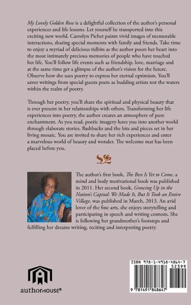 My Lovely Golden Rose is a delightful collection of the author's personal experiences and life lessons. Let yourself be transported into this exciting new world. Carrolyn Pichet paints vivid images of memorable interactions, sharing special moments with family and friends. Take time to enjoy a myriad of delicious tidbits as the author pours her heart into the most intimately precious memories of people who have touched her life. You'll follow life events such as friendship, love, marriage and at the same time get a glimpse of the author's vision for the future. Observe how she uses poetry to express her eternal optimism. You'll savor writings from special guests poets as budding artists test the waters within the realm of poetry. Through her poetry, you'll share the spiritual and physical beauty that is ever present in her relationships with others. Transforming her life experiences into poetry, the author creates an atmosphere of pure enchantment. As you read, poetic imagery lures you into another world through elaborate stories, flashbacks and the bits and pieces set in her living mosaic. You are invited to share her rich experiences and enter a marvelous world of beauty and wonder. The welcome mat has been placed before you.