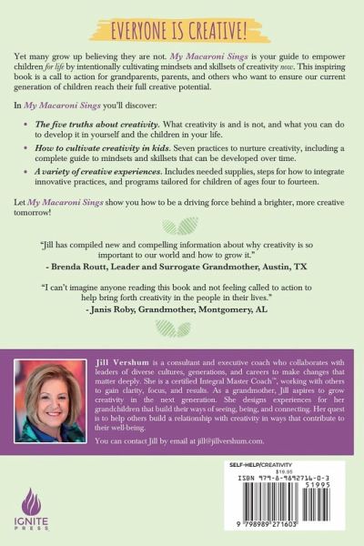 Yet many grow up believing they are not. My Macaroni Sings is your guide to empower children for life by intentionally cultivating mindsets and skillsets of creativity now. This inspiring book is a call to action for grandparents, parents, and others who want to ensure our current generation of children reach their full creative potential. In My Macaroni Sings you'll discover:The five truths about creativity. What creativity is and is not, and what you can do to develop it in yourself and the children in your life. How to cultivate creativity in kids. Seven practices to nurture creativity, including a complete guide to mindsets and skillsets that can be developed over time. A variety of creative experiences. Includes needed supplies, steps for how to integrate innovative practices, and programs tailored for children of ages 4 to 14+. Let My Macaroni Sings show you how to be a driving force behind a brighter, more creative tomorrow!