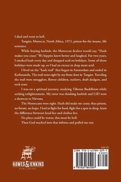 I died and went to hell. Tangier, Morocco, North Africa, 1972, prison for the insane, life sentence. While buying hashish, the Moroccan dealers would say, "Hash makes you crazy." We hippies knew better and laughed. For two years, I smoked hash every day and dropped acid on holidays. Some of those holidays were made up, so I had an excuse to drop more acid. I lived on the "hash trail" that began in Amsterdam and ended in Kathmandu. The trail went right by my front door in Tangier. Traveling the trail were smugglers, flower children, outlaws, draft dodgers, and rock stars. I was on a spiritual journey, studying Tibetan Buddhism while seeking enlightenment. My error was thinking hashish and LSD were a shortcut to Nirvana. The Moroccans were right. Hash did make me crazy, thus prison, no future, no hope. I had to fight for food, fight for a spot to sleep, learn the difference between head lice and clothes lice. No place could be worse; this must be hell. Then God reached into that inferno and pulled me out.