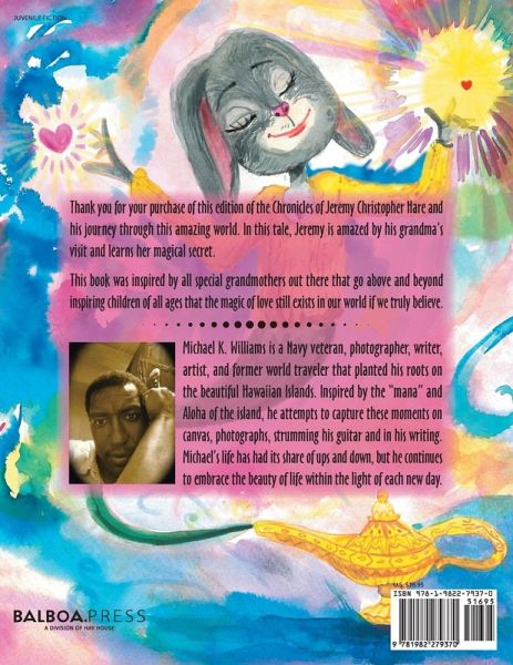 Thank you for your purchase of this edition of the Chronicles of Jeremy Christopher Hare and his journey through this amazing world. In this tale, Jeremy is amazed by his grandma's visit and learns her magical secret. This book was inspired by all special grandmothers out there that go above and beyond inspiring children of all ages that the magic of love still exists in our world if we truly believe.