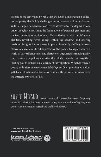 Prepare to be captivated by My Magnum Opus, a mesmerizing collection of poetry that boldly challenges the very essence of our existence. With a unique perspective, each verse delves into the depths of our inner thoughts, unearthing the foundations of personal greatness and the true meaning of achievement. This anthology embraces life's complexities, revealing silver linings within the shadows and offering profound insights into our cosmic place. Seamlessly shifting between elusive nuances and direct expressions, the poems transport you to a world of surreal landscapes and characters. Organized chronologically, they create a compelling narrative that binds the collection together, inviting you to embark on a journey of introspection. Whether you're a poetry enthusiast or a newcomer, My Magnum Opus promises an unforgettable exploration of self-discovery, where the power of words unveils the intricate mysteries of life.