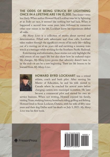 THE ODDS OF BEING STRUCK BY LIGHTNING ONCE IN A LIFETIME ARE 1 IN 15,300. Two times-even less likely. When author Howard Byrd Lockhart was hit by lightning at an Indy car race, it seemed like nothing but bad luck. When it happened a second time some years later, followed by numerous other near misses in his life, Lockhart knew his experiences defied all odds. My Many Lives is a collection of stories about survival and determination. Filled with adventures and close calls, Lockhart takes readers through the significant events of his early life-falling out of a moving car at six years old and surviving a runaway train wreck as a teenager while working for the Southern Pacific Railroad. Entertaining and informative, these stories not only highlight the wild events of one man's life but also show how he endured major life changes. My Many Lives proves that adversity doesn't have to be the end-it can be a new beginning. There are life lessons to be learned from My Many Lives.