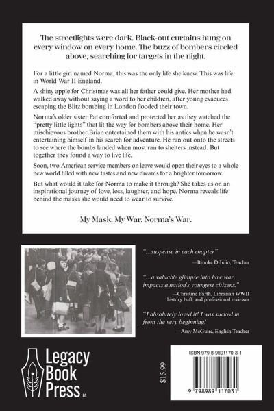 The streetlights were dark. Black-out curtains hung on every window on every home. The buzz of bombers circled above, searching for targets in the night. For a little girl named Norma, this was the only life she knew. This was life in World War II England. A shiny apple for Christmas was all her father could give. Her mother had walked away without saying a word to her children, after young evacuees escaping the Blitz bombing in London flooded their town. Norma's older sister Pat comforted and protected her as they watched the "pretty little lights" that lit the way for bombers above their home. Her mischievous brother Brian entertained them with his antics when he wasn't entertaining himself in his search for adventure. He ran out onto the streets to see where the bombs landed when most ran to shelters instead. But together they found a way to live life. Soon, two American service members on leave would open their eyes to a whole new world filled with new tastes and new dreams for a brighter tomorrow. But what would it take for Norma to make it through? She takes us on an inspirational journey of love, loss, laughter, and hope. Norma reveals life behind the masks she would need to wear to survive. My Mask. My War. Norma's War. The streetlights were dark. Black-out curtains hung on every window on every home. The buzz of bombers circled above, searching for targets in the night. For a little girl named Norma, this was the only life she knew. This was life in World War II England. A shiny apple for Christmas was all her father could give. Her mother had walked away without saying a word to her children, after young evacuees escaping the Blitz bombing in London flooded their town. Norma's older sister Pat comforted and protected her as they watched the "pretty little lights" that lit the way for bombers above their home. Her mischievous brother Brian entertained them with his antics when he wasn't entertaining himself in his search for adventure. He ran out onto the streets to see where the bombs landed when most ran to shelters instead. But together they found a way to live life. Soon, two American service members on leave would open their eyes to a whole new world filled with new tastes and new dreams for a brighter tomorrow. But what would it take for Norma to make it through? She takes us on an inspirational journey of love, loss, laughter, and hope. Norma reveals life behind the masks she would need to wear to survive. My Mask. My War. Norma's War. ***** A portion of the proceeds from this book are being donated to support non-profit veteran's programs.