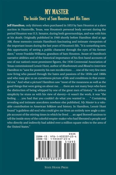 Jeff Hamilton, only thirteen when purchased in 1853 by Sam Houston at a slave auction in Huntsville, Texas, was Houston's personal body servant during the period Houston was US Senator, during both governorships, and was with Houston at his death. These memoirs contain Hamilton's viewpoints of the issues during the last years of Houston's life.