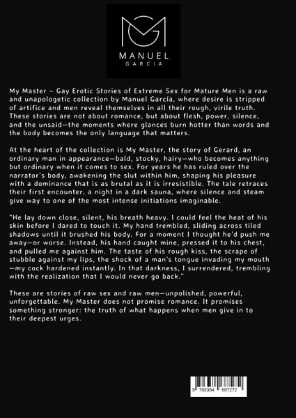 My Master - Gay Erotic Stories of Extreme Sex for Mature Men is a raw and unapologetic collection by Manuel García, where desire is stripped of artifice and men reveal themselves in all their rough, virile truth. These stories are not about romance, but about flesh, power, silence, and the unsaid-the moments where glances burn hotter than words and the body becomes the only language that matters.At the heart of the collection is My Master, the story of Gerard, an ordinary man in appearance-bald, stocky, hairy-who becomes anything but ordinary when it comes to sex. For years he has ruled over the narrator's body, awakening the slut within him, shaping his pleasure with a dominance that is as brutal as it is irresistible. The tale retraces their first encounter, a night in a dark sauna, where silence and steam give way to one of the most intense initiations imaginable."He lay down close, silent, his breath heavy. I could feel the heat of his skin before I dared to touch it. My handtrembled, sliding across tiled shadows until it brushed his body. For a moment I thought he'd push me away-or worse. Instead, his hand caught mine, pressed it to his chest, and pulled me against him. The taste of his rough kiss, the scrape of stubble against my lips, the shock of a man's tongue invading my mouth-my cock hardened instantly. In that darkness, I surrendered, trembling with the realization that I would never go back."These are stories of raw sex and raw men-unpolished, powerful, unforgettable. My Master does not promise romance. It promises something stronger: the truth of what happens when men give in to their deepest urges.