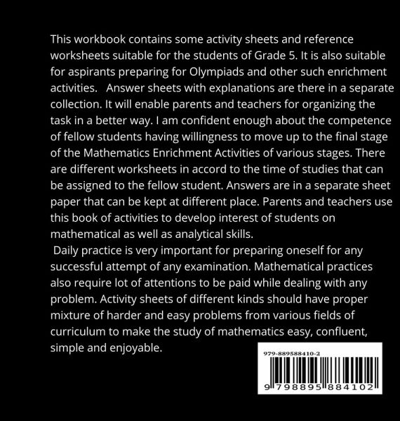 This workbook contains some activity sheets and reference worksheets suitable for the students of Grade 5. It is also suitable for aspirants preparing for Olympiads and other such enrichment activities. Answer sheets with explanations are there in a separate collection. It will enable parents and teachers for organizing the task in a better way. I am confident enough about the competence of fellow students having willingness to move up to the final stage of the Mathematics Enrichment Activities of various stages. There are different worksheets in accord to the time of studies that can be assigned to the fellow student. Answers are in a separate sheet paper that can be kept at different place. Parents and teachers use this book of activities to develop interest of students on mathematical as well as analytical skills. Daily practice is very important for preparing oneself for any successful attempt of any examination. Mathematical practices also require lot of attentions to be paid while dealing with any problem. Activity sheets of different kinds should have proper mixture of harder and easy problems from various fields of curriculum to make the study of mathematics easy, confluent, simple and enjoyable.