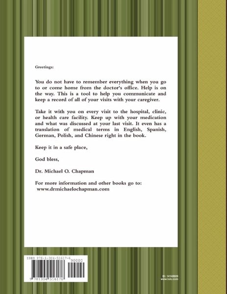 You do not have to remember everything when you go to or come home from the doctor's office. Help is on the way. This is a tool to help you communicate and keep a record of all of your visits with your caregiver. Simple fill in the form for all of your needs and concerns. All in one place. It makes doctor visits less stressful for everyone. And you can keep a book for everyone in the home. Take it with you on every visit to the hospital, clinic, or health care facility. Keep up with your medication and what was discussed at your last visit. It even has a translation of medical terms in English, Spanish, German, Polish, and Chinese right in the book. Keep it in a safe place, God bless, Dr. Michael O. Chapman For more information and other books go to: www.drmichaelochapman.com