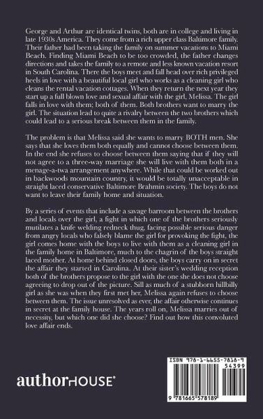 George and Arthur are identical twins, both are in college and living in late 1930s America. They come from a rich upper class Baltimore family. Their father had been taking the family on summer vacations to Miami Beach. Finding Miami Beach to be too crowded, the father changes directions and takes the family to a remote and less known vacation resort in South Carolina. There the boys meet and fall head over rich privileged heels in love with a beautiful local girl who works as a cleaning girl who cleans the rental vacation cottages. When they return the next year they start up a full blown love and sexual affair with the girl, Melissa. The girl falls in love with them; both of them. Both brothers want to marry the girl. The situation lead to quite a rivalry between the two brothers which could lead to a serious break between them in the family. The problem is that Melissa said she wants to marry BOTH men. She says that she loves them both equally and cannot choose between them. In the end she refuses to choose between them saying that if they will not agree to a three-way marriage she will live with them both in a menage-a-twa arrangement anywhere. While that could be worked out in backwoods mountain country, it would be totally unacceptable in straight laced conservative Baltimore Brahmin society. The boys do not want to leave their family home and situation. By a series of events that include a savage barroom between the brothers and locals over the girl, a fight in which one of the brothers seriously mutilates a knife welding redneck thug, facing possible serious danger from angry locals who falsely blame the girl for provoking the fight, the girl comes home with the boys to live with them as a cleaning girl in the family home in Baltimore, much to the chagrin of the boys straight laced mother. At home behind closed doors, the boys carry on in secret the affair they started in Carolina. At their sister's wedding reception both of the brothers propose to the girl with the one she does not choose agreeing to drop out of the picture. Sill as much of a stubborn hillbilly girl as she was when they first met her, Melissa again refuses to choose between them. The issue unresolved as ever, the affair otherwise continues in secret at the family house. The years roll on, Melissa marries out of necessity, but which one did she choose? Find out how this convoluted love affair ends.