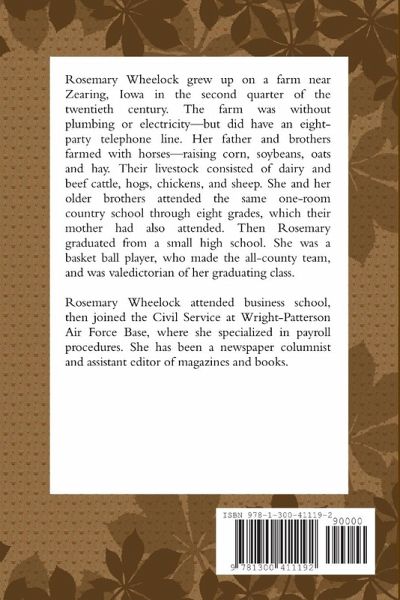Rosemary Wheelock grew up on a farm near Zearing, Iowa in the second quarter of the twentieth century. The farm was without plumbing or electricity-but did have an eight-party telephone line. Her father and brothers farmed with horses-raising corn, soybeans, oats and hay. Their livestock consisted of dairy and beef cattle, hogs, chickens, and sheep. She and her older brothers attended the same one-room country school through eight grades, which their mother had also attended. Then Rosemary graduated from a small high school. She was a basket ball player, who made the all-county team, and was valedictorian of her graduating class.