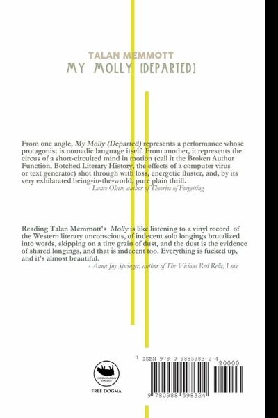 From one angle, My Molly (Departed) represents a performance whose protagonist is nomadic language itself. From another, it represents the circus of a short-circuited mind in motion (call it the Broken Author Function, Botched Literary History, the effects of a computer virus of text generator) shot through with loss, energetic fluster, and, by its very exhilirated being-in-the-world, pure plain thrill. - Lance Olsen, author of Theories of Forgetting Reading Talan Memmott's Molly is like listening to a vinyl record of the Western literary unconscious, of indecent solo longings brutalized into words, skipping on a tiny grain of dust, and the dust is the evidence of shared longings, and that is indecent too. Everything is fucked up, and it's almost beautiful. - Anna Joy Springer author of The Vicious Red Relic, Love