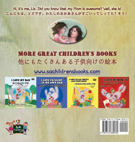 English Japanese Bilingual Book. Perfect for kids studying English or Japanese as their second language. In this touching bedtime story, a little girl describes why her Mom is awesome. We see her going through her day, carrying the warmest feeling about her mother. Mom always knows how she feels and can help with any problem. Mom can make the most complicated braid and explain fractions; Mom can help to wake her up in the morning and hug her tightly when she's sad. With adorable illustrations and a message to which everyone can relate, this is a perfect book for kids and their moms.