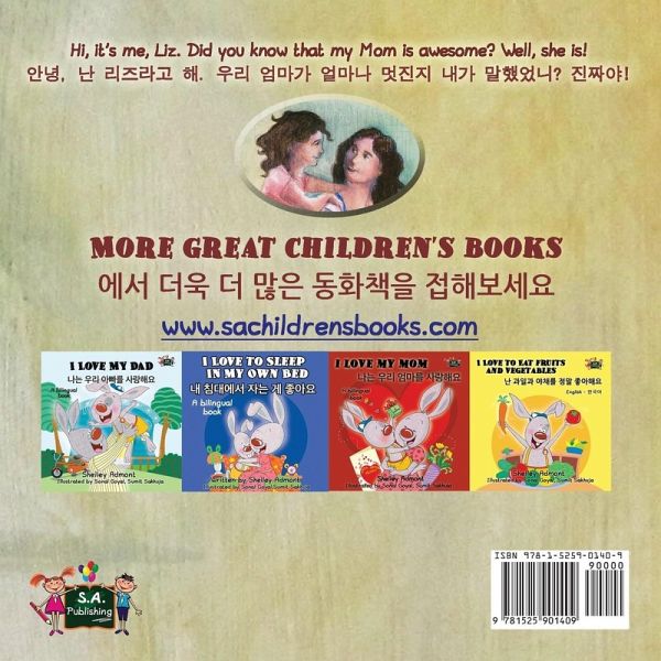 English Korean Bilingual Book. Perfect for kids studying English or Korean as their second language. In this touching bedtime story, a little girl describes why her Mom is awesome. We see her going through her day, carrying the warmest feeling about her mother. Mom always knows how she feels and can help with any problem. Mom can make the most complicated braid and explain fractions; Mom can help to wake her up in the morning and hug her tightly when she's sad. With adorable illustrations and a message to which everyone can relate, this is a perfect book for kids and their moms.