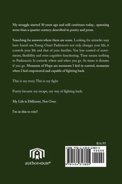 My struggle started 30 years ago and still continues today...spanning more than a quarter century..described in poetry and prose. Searching for answers where there are none. Looking for miracles may have found one.Young Onset Parkinson's not only changes your life, it controls your life and that of your families. You lose control of movements, flexibility and even cognitive functioning. Time means nothing to Parkinson's. It controls where and when you go. At times it dictates if you go. Moments of Hope are moments I feel in control, moments when I feel empowered and capable of fighting back. This is my story. This is my fight. Poetry became my escape, my way of fighting back. My Life is Different, Not Over. I'm in this to win!!