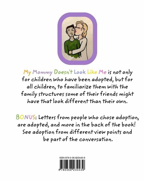 "My Mommy Doesn't Look Like Me" is not only for children who have been adopted, but for all children, to familiarize them with the family structures some of their friends might have that look different than their own. As well as for parents, who may easily 'single-story' family structures that are made up of different ethnicities or have trouble explaining adoption to their little ones. Included, are letters from people who chose adoption, are adopted, foster care, and more. See adoption from different view points and be part of the conversation.