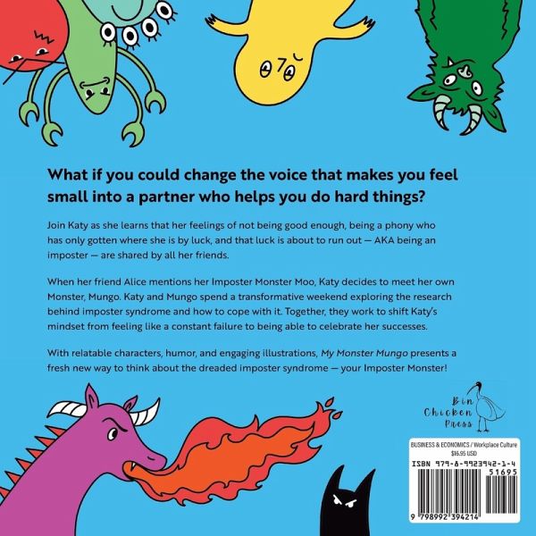 What if you could change the voice that makes you feel small into a partner who helps you do hard things? Join Katy as she learns that her feelings of not being good enough, being a phony who has only gotten where she is by luck, and that luck is about to run out - AKA being an imposter - are shared by all her friends. When her friend Alice mentions her Imposter Monster Moo, Katy decides to meet her own monster, Mungo. Katy and Mungo spend a transformative weekend exploring the research behind imposter syndrome and how to cope with it. Together, they work to shift Katy's mindset from feeling like a constant failure to being able to celebrate her successes. With relatable characters, humor, and engaging illustrations, My Monster Mungo presents afresh new way to think about the dreaded imposter syndrome - your Imposter Monster.