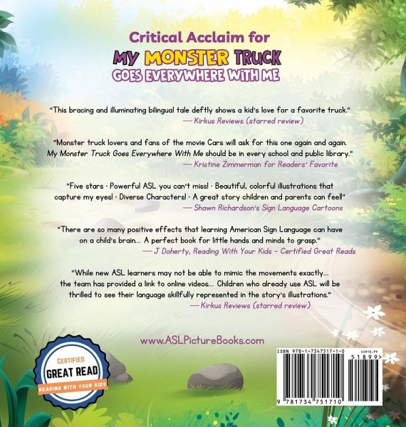 Vroom-vroom! This big-wheeled treasure brings him joy... until it goes missing. This little boy loves monster trucks and playing at Grandma's house! But after an exhausting day with his big, purple, and loud favorite toy, he's devastated to discover the shiny truck is gone! Is it hiding somewhere? Did he leave it at Grandma's? Will he ever see his beloved best friend again? In this delightfully engaging story with stunning illustrations and familiar themes, Kathleen Marcath invites young readers to interact by using American Sign Language along with the characters in the book. And with 32 ASL signs shown in easy-to-understand images, downloadable educational sheets, and a QR code for ASL video lessons, kids will spark their bilingual journey through a colorful and powerful resource. My Monster Truck Goes Everywhere with Me - Illustrated in American Sign Language is a beautiful children's picture book. If you or your child like overcoming relatable problems, learning new things, and feel-good entertainment, then you'll adore Kathleen Marcath's happy ride. Buy My Monster Truck Goes Everywhere with Me to zoom into adventure today! A Kirkus Starred Review and Best Indie Book of 2021! VALUE - The book also comes with four instructional videos. ASL Picture Books is excited to bring you the best in ASL storytellers with Deaf artists Michelle Osterhout and Diana Campbell. A thrilling narration by radio personality Dennis Neubacher. VALUE - Each page of My Monster Truck Goes Everywhere with Me is beautifully illustrated with one or more signs that parents and children can learn together. This book is as educational as it is entertaining. VALUE - ¿¿¿¿¿¿¿Download five educational sheets. ASL Alphabet Chart, Basic ASL Education, Fingerspelling, Signers' Space, Classifier CL3, and Sign Selection.