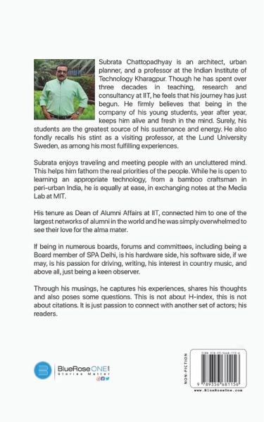 Subrata Chattopadhyay, is an architect and urban planner and a professor at the Indian Institute of Technology Kharagpur. Though he has spent over three decades in teaching, research and consultancy at IIT, he feels that his journey has just begun. He firmly believes that being in the company of his young students, year after year, keeps him alive and fresh in the mind. Surely, his students are the greatest source of his sustenance and energy. He also fondly recalls his stint as visiting professor, in Lund University Sweden, as among his most fulfilling experiences. Subrata enjoys traveling and meeting people with an uncluttered mind. This helps him fathom the real priorities of the people. While he is open to learning an appropriate technology, from a bamboo craftsman in peri-urban India, he is equally at ease, in exchanging notes at the Media Lab in MIT. His tenure as Dean of Alumni Affairs at IIT, connected him to one of the largest networks of alumni in the world and he was simply overwhelmed to see their love for the alma mater. If being in numerous boards, forums and committees, including being a Board member of SPA Delhi, is his hardware side, his software side, if we may, is his passion for driving, writing, his interest in country music, and above all, just being a keen observer. Through his musings, he captures his experiences, shares his thoughts and also poses some questions. This is not about H-index, this is not about citations. It is just passion to connect with another set of actors; his readers.