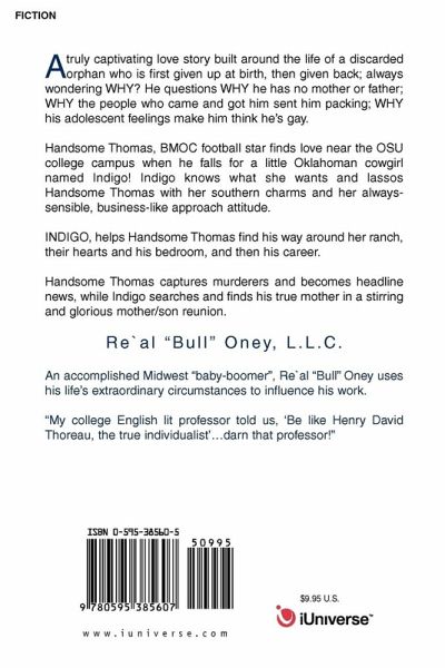 A truly captivating love story built around the life of a discarded orphan who is first given up at birth, then given back; always wondering WHY? He questions WHY he has no mother or father; WHY the people who came and got him sent him packing; WHY his adolescent feelings make him think he's gay. Handsome Thomas, BMOC football star finds love near the OSU college campus when he falls for a little Oklahoman cowgirl named Indigo! Indigo knows what she wants and lassos Handsome Thomas with her southern charms and her always-sensible, business-like approach attitude. INDIGO, helps Handsome Thomas find his way around her ranch, their hearts and his bedroom, and then his career. Handsome Thomas captures murderers and becomes headline news, while Indigo searches and finds his true mother in a stirring and glorious mother/son reunion.