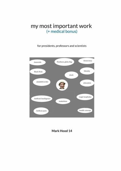 Summary of my work: Assassn-14Ko and my formula, black hole and Andromeda, asteroids, sun, AI artificial body parts, flag and screen for the Bundestag, shapes, colors, world clock, west-east lag and line, Crimea solution, God's spark, table of goodness, school, worktime, nutrition, sex old town, identity, optimized democracy, legal loopholes, violence... Bonus section for medical professionals: health overview, hazards, medical problems and solutions, vitamin chart, viral diseases, CMV solution, bacterial diseases, lung cancer, liver problems, cancer therapies, antibody pad against snake venom, model - treadmill with warm sand