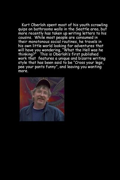 Kurt Oberloh spent most of his youth scrawling quips on bathrooms walls in the Seattle area, but more recently has taken up writing letters to his cousins. This book contains some of those letters. While most people are consumed in their monotonous social routines, he travels in his own little world looking for adventures that will have you wondering, "What the Hell was he thinking?" This is Oberloh's first published work that features a unique and bizarre writing style that has been said to be "Cross your legs, pee your pants funny", and leaving you wanting more.