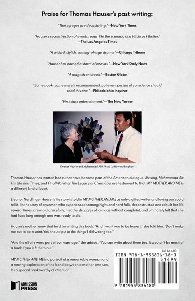 Thomas Hauser has written books that have become part of the American dialogue. Missing, Muhammad Ali: His Life and Times, and Final Warning: The Legacy of Chernobyl are testament to that. MY MOTHER and me is a different kind of book. Eleanor Nordlinger Hauser's life story is told in MY MOTHER and me as only a gifted writer and loving son could tell it.It's the story of a woman who experienced soaring highs and hard falls, deconstructed and rebuilt her life several times, grew old gracefully, met the struggles of old age without complaint and, ultimately, felt that she had lived long enough and was ready to die. Hauser's mother knew that he'd be writing this book. "And I want you to be honest," she told him. "Don't make me out to be a saint. You should put in the things I did wrong too." "And the affairs were part of our marriage," she added. "You can write about them too. It wouldn't be much of a book if you left them out." MY MOTHER and me is a portrait of a remarkable woman and a moving exploration of the bond between a mother and son. It's a special book worthy of attention.