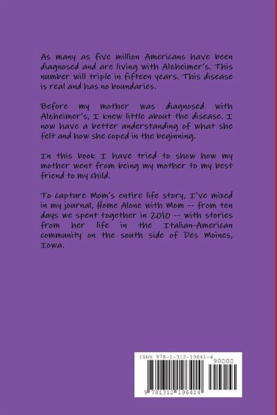 As many as five million Americans have been diagnosed and are living with Alzheimer's. This number will triple in fifteen years. This disease is real and has no boundaries. Before my mother was diagnosed with Alzheimer's, I knew little about the disease. I now have a better understanding of what she felt and how she coped in the beginning. In this book I have tried to show how my mother went from being my mother to my best friend to my child. To capture Mom's entire life story, I've mixed in my journal, Home Alone with Mom -- from ten days we spent together in 2010 -- with stories from her life in the Italian-American community on the south side of Des Moines, Iowa.