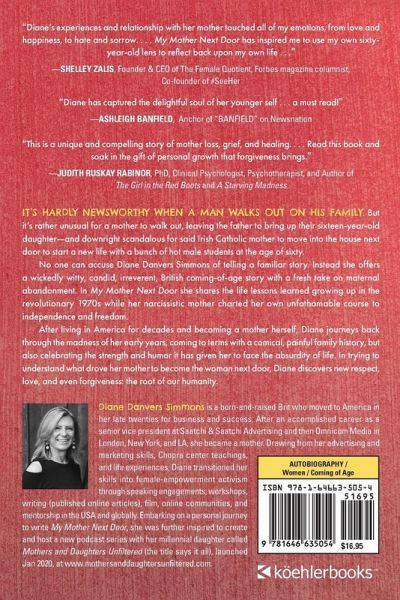 It's hardly newsworthy when a man walks out on his family. But it's rather unusual for a mother to walk out, leaving the father to bring up their sixteen-year-old daughter-and downright scandalous for said Irish Catholic mother to move into the house next door to start a new life with a bunch of hot male students at the age of sixty. No one can accuse Diane Danvers Simmons of telling a familiar story. Instead she offers a wickedly witty, candid, irreverent, British coming-of-age story with a fresh take on maternal abandonment. In My Mother Next Door she shares the life lessons learned growing up in the revolutionary 1970s while her narcissistic mother charted her own unfathomable course to independence and freedom. After living in America for decades and becoming a mother herself, Diane journeys back through the madness of her early years, coming to terms with a comical, painful family history, but also celebrating the strength and humor it has given her to face the absurdity of life. In trying to understand what drove her mother to become the woman next door, Diane discovers new respect, love, and even forgiveness: the root of our humanity.