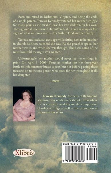 My Mother Smiled Down from Heaven Today is a wonderful collection of faith inspired poetry written by Terressa Kennedy's mother. Even at a young age Terressa had noticed how talented and strong her mother was. Indeed being a single parent she had to strive hard in order to raise her children. But despite it all she still had great faith and persisted in her love for the written word. Unfortunately, her mother would never see her writings in print. On April 3, 2003, Terressa's mother lost her three year battle to inflammatory breast cancer, but not before passing these treasures on to the one person who cared for her throughout it all, her daughter.