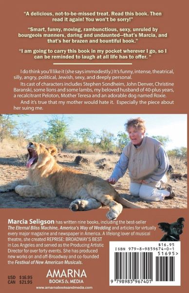Marcia Seligson says, "My new book is called My Mother Would Hate This Book. And she probably would because it's pretty wild. It's about the adventurous journey that's been my life, from chasing Mother Teresa around India, to trotting around with lions in Kenya, to camping in Big Sur with John Denver, to watching for UFOS with Steven Spielberg in the California desert...all the escapades I've had while being a journalist, like seeking out shamans in Peru. I've also written nine books, my first one a best seller. This one is also about my adventures of producing musical theatre and cavorting with great stars like Christine Baranski, David Hyde Pierce, Kelsey Grammer, Jason Alexander, Jean Smart and so many more. I think my book is entertaining, funny, intense, theatrical, angry, political, sexy, and deeply personal. Writer Sheilah Rae said: "I couldn't put down this collection of essays on a life lived large. Marcia Seligson is a brilliant raconteur and full of fun." That's my intention. My mother might not like it but I think you will.