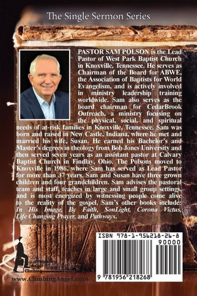 PASTOR SAM POLSON is the Lead Pastor of West Park Baptist Church in Knoxville, Tennessee. He serves as Chairman of the Board for ABWE, the Association of Baptists for World Evangelism, and is actively involved in ministry leadership training worldwide. Sam also serves as the board chairman for CedarBrook Outreach, a ministry focusing on the physical, social, and spiritual needs of at-risk families in Knoxville, Tennessee. Sam was born and raised in New Castle, Indiana, where he met and married his wife, Susan. He earned his Bachelor's and Master's degrees in theology from Bob Jones University and then served seven years as an assistant pastor at Calvary Baptist Church in Findlay, Ohio. The Polsons moved to Knoxville in 1986, where Sam has served as Lead Pastor for more than 37 years. Sam and Susan have three grown children and four grandchildren. Sam advises the pastoral team and staff, teaches in large and small group settings, and is most energized by witnessing people come alive to the reality of the gospel. Sam's other books include: In His Image, By Faith, SonLight, Corona Victus, Life Changing Prayer, and Pathways.