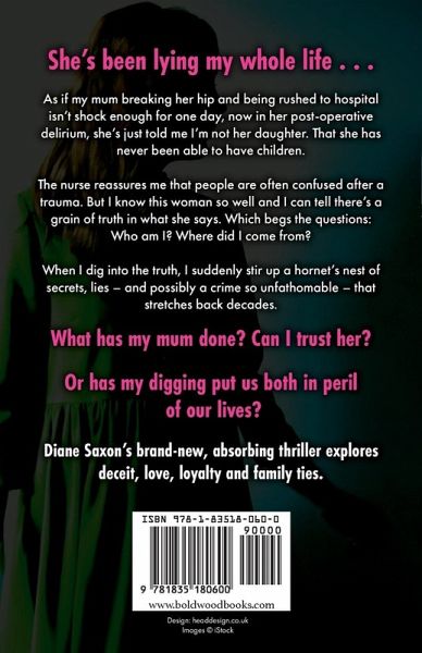 The BRAND-NEW psychological thriller from bestseller Diane Saxon She's been lying my whole life... As if my mum breaking her hip and being rushed to hospital isn't shocking enough for one day, now in her post-operative delirium, she's just told me I'm not her daughter. That she has never been able to have children. The nurse reassures me that people are often confused after a trauma. But I know this woman so well and I can tell there's a grain of truth in what she says. Which begs the questions: Who am I? Where did I come from? When I dig into the truth, I suddenly stir up a hornet's nest of secrets, lies - and possibly a crime so unfathomable - that stretches back decades. What has my mum done? Can I trust her? Or has my digging put us both in peril of our lives? Diane Saxon's new, absorbing thriller explores deceit, love, loyalty and family ties.