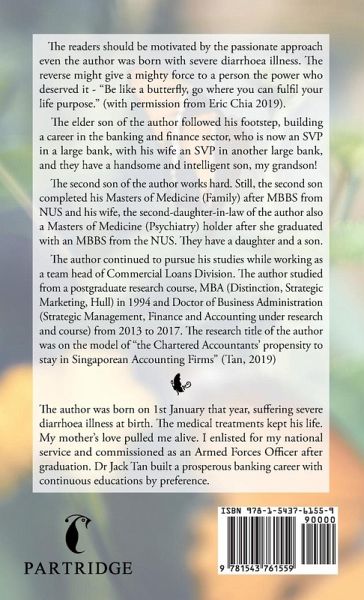The readers should be motivated by the passionate approach even the author was born with severe diarrhoea illness. The reverse might give a mighty force to a person the power who deserved it - "Be like a butterfly, go where you can fulfil your life purpose." (with permission from Eric Chia 2019). The elder son of the author followed his footstep, building a career in the banking and finance sector, who is now an SVP in a large bank, with his wife an SVP in another large bank, and they have a handsome and intelligent son, my grandson! The second son of the author works hard. Still, the second son completed his Masters of Medicine (Family) after MBBS from NUS and his wife, the second-daughter-in-law of the author also a Masters of Medicine (Psychiatry) holder after she graduated with an MBBS from the NUS. They have a daughter and a son. The author continued to pursue his studies while working as a team head of Commercial Loans Division. The author studied from a postgraduate research course, MBA (Distinction, Strategic Marketing, Hull) in 1994 and Doctor of Business Administration (Strategic Management, Finance and Accounting under research and course) from 2013 to 2017. The research title of the author was on the model of "the Chartered Accountants' propensity to stay in Singaporean Accounting Firms" (Tan, 2019)