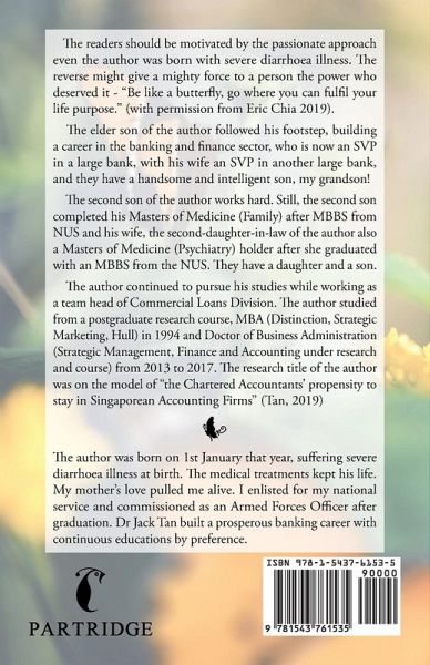 The readers should be motivated by the passionate approach even the author was born with severe diarrhoea illness. The reverse might give a mighty force to a person the power who deserved it - "Be like a butterfly, go where you can fulfil your life purpose." (with permission from Eric Chia 2019). The elder son of the author followed his footstep, building a career in the banking and finance sector, who is now an SVP in a large bank, with his wife an SVP in another large bank, and they have a handsome and intelligent son, my grandson! The second son of the author works hard. Still, the second son completed his Masters of Medicine (Family) after MBBS from NUS and his wife, the second-daughter-in-law of the author also a Masters of Medicine (Psychiatry) holder after she graduated with an MBBS from the NUS. They have a daughter and a son. The author continued to pursue his studies while working as a team head of Commercial Loans Division. The author studied from a postgraduate research course, MBA (Distinction, Strategic Marketing, Hull) in 1994 and Doctor of Business Administration (Strategic Management, Finance and Accounting under research and course) from 2013 to 2017. The research title of the author was on the model of "the Chartered Accountants' propensity to stay in Singaporean Accounting Firms" (Tan, 2019)