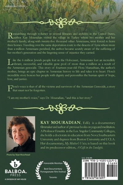 Researching through volumes in several libraries and archives in the United States, author Kay Mouradian visited the village in Turkey where her mother and her mother's family, along with twenty-five thousand other Armenians, were forced to leave their homes. Traveling over the same deportation route to the deserts of Syria where more than a million Armenians perished, the author became acutely aware of the suffering of her mother's generation and the lingering sense of injustice they carried. Like the 6 million Jewish people lost in the Holocaust, Armenians lost an incredibly vibrant, successful, and valuable gene pool of more than a million as a result of the Armenian genocide. This story of fourteen-year-old Flora Munushian, the author's mother, brings an epic chapter in Armenian history to life and takes it to heart. Flora's incredible story honors her people with dignity and personifies the human spirit of hope, love, and justice. Flora's voice is that of all the victims and survivors of the Armenian Genocide, a story that must not be forgotten. "I am my mother's voice," says Dr. Mouradian, "and this is her story."