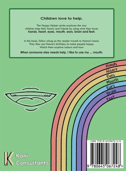 Children love to help. Written for 3-5 year olds, the Happy Helper series explores the way children help their family and friends by using what they have - hands, heart, eyes, mouth, ears, brain and feet. In this book, follow along as the reader uses other people's birthdays to make people happy, by exploring how: When someone else needs help, I like to use my ... mouth.
