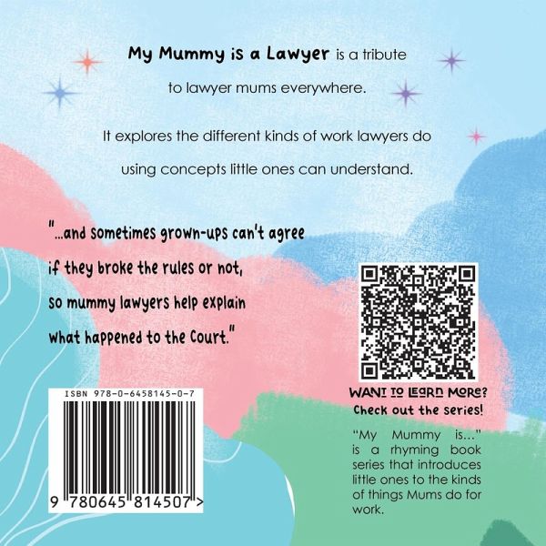 My Mummy is a Lawyer is a tribute to lawyer mums everywhere. It explores the different kinds of work lawyers do using concepts little ones can understand. In-house lawyers, tech lawyers, IP lawyers, litigators, family lawyers, personal injury lawyers, lawyers who contract and lawyers who draft laws are all represented in this inclusive and heartwarming book.