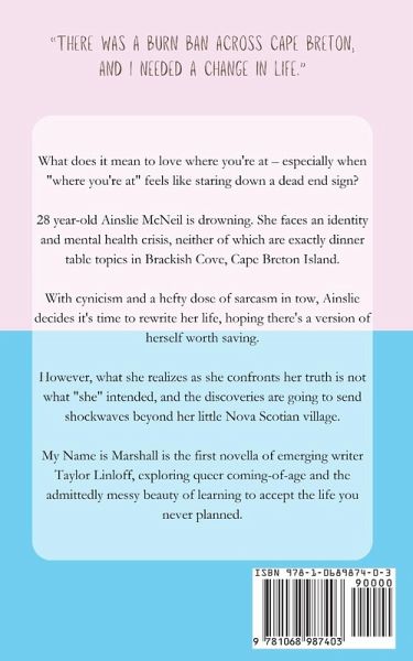 What does it mean to love where you're at - especially when "where you're at" feels like staring down a dead end sign? 28 year-old Ainslie McNeil is drowning. She faces an identity and mental health crisis, neither of which are exactly dinner table topics in Brackish Cove, Cape Breton Island. With cynicism and a hefty dose of sarcasm in tow, Ainslie decides it's time to rewrite her life, hoping there's a version of herself worth saving. However, realization hits as truths are confronted, and all is not what "she" intended, and the discoveries are going to send shockwaves beyond her little Nova Scotian village. My Name is Marshall is the first novella of emerging writer Taylor Linloff, exploring queer coming-of-age and the admittedly messy beauty of learning to accept the life you never planned.