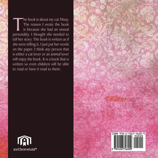 The book is about my cat Missy. The reason I wrote the book is because she had an unusal personality. I thought she needed to tell her story. The book is written as if she were telling it, I just put her words on the paper. I think any person that is either a cat lover or an animal lover will enjoy the book. It is a book that is written so even children will be able to read or have it read to them.