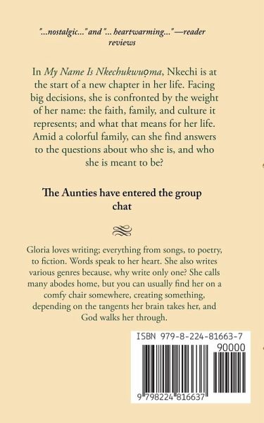 "...nostalgic..." and "... heartwarming..." -reader reviews In My Name Is Nkechukwüma, Nkechi is at the start of a new chapter in her life. Facing big decisions, she is confronted by the weight of her name: the faith, family, and culture it represents; and what that means for her life. Amid a colorful family, can she find answers to the questions about who she is, and who she is meant to be? The Aunties have entered the group chat.